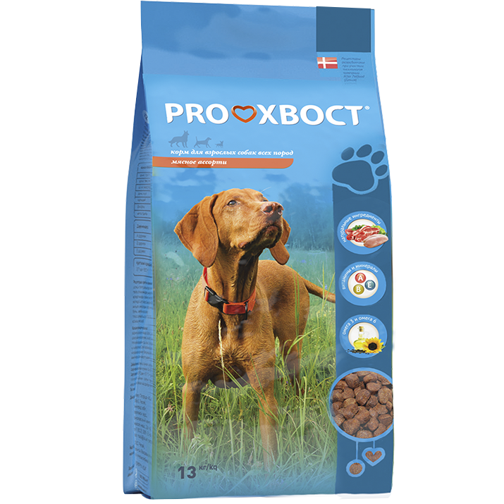 Proхвост "Мясное ассорти" - рацион с несколькими видами мяса для собак-гурманов. Сухой корм подходит для ежедневного кормления взрослых питомцев всех пород.