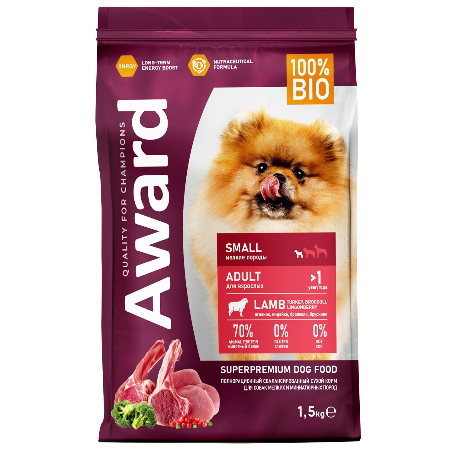 Сухой корм AWARD для взрослых собак мелких и миниатюрных пород с ягненком и индейкой с добавлением брокколи и брусники 1,5 кг.