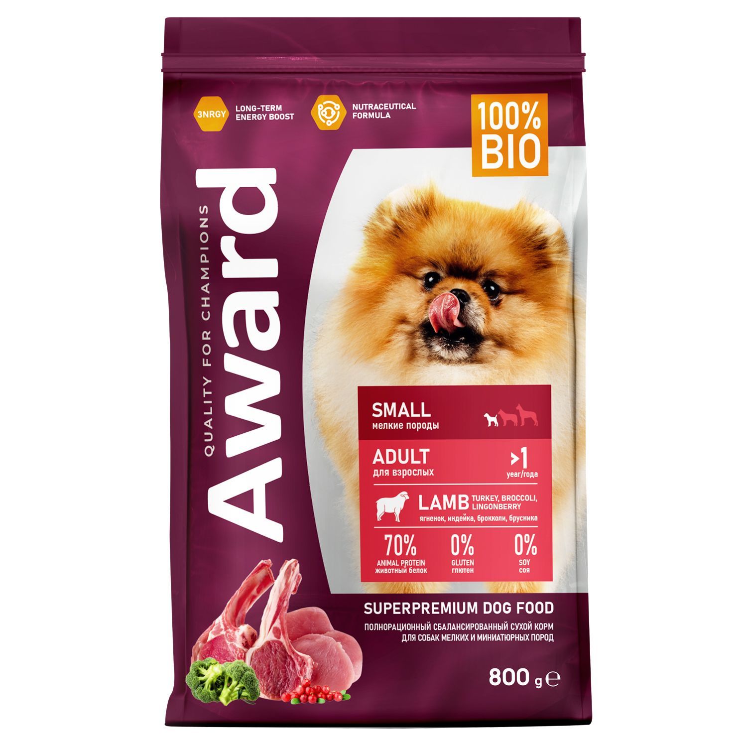 Корм для собак AWARD Small Эвард для мелких и миниатюрных пород с ягненком и индейкой с добавлением брокколи и брусники 800 г сух. пакет**