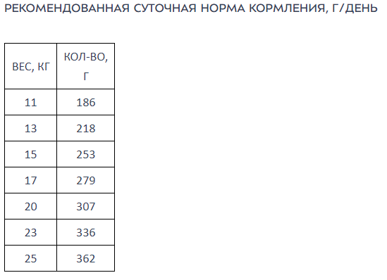 Рекомендуемую ежедневную порцию корма (см. таблицу на упаковке или на сайте) можно разделить на два кормления. Индивидуальные потребности в питании могут отличаться в зависимости от размера, возраста и активности питомца. У собаки всегда должен быть доступ к свежей питьевой воде. Рекомендуется вводить корм в рацион питомца постепенно в течение недели. Корм предназначен исключительно для домашних животных и не предназначен для употребления в пищу человеком.