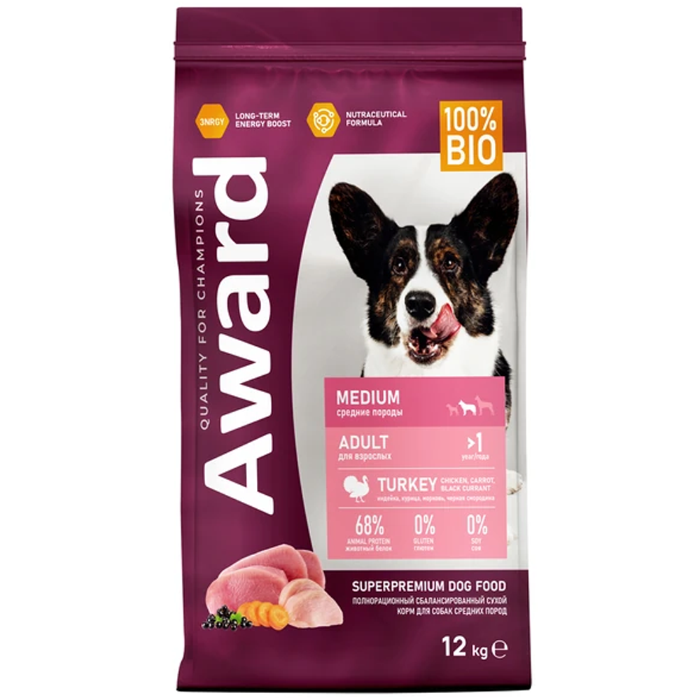 Сухой корм AWARD для взрослых собак средних пород с индейкой и курицей с добавлением моркови и черной смородины 12 кг.