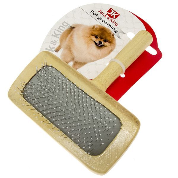 Частая металлическая щетина с каплями на концах проникает глубоко в шерсть, эффективно вычесывая отмершие волоски, не травмируя кожу.